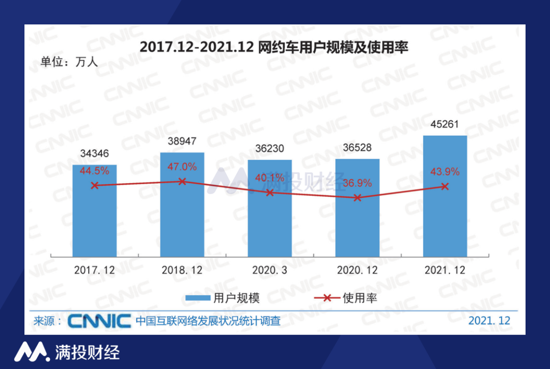 中国互联网络中心发布的《第49次中国互联网络发展状况统计报告》也显示,截至2021年12月,我国网约车用户规模达4.53亿,较 2020 年12月增长8733万,占网民整体的 43.9%。我国的网约车市场发展稳定,规模持续扩大。