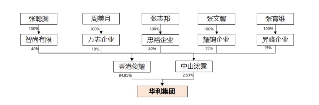 截至去年年末,前述五人通过智尚有限、万志企业、忠裕企业、耀锦企业、昇峰企业控制着香港俊耀、中山浤霆。而香港俊耀、中山浤霆分别持有华利集团84.85%、2.63%的股份。据此计算,张聪渊家族的合计持股比例高达惊人的87.48%。