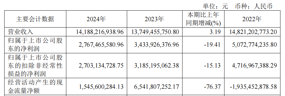 现实情况是,尽管雅戈尔2024年实现营业收入141.88亿元,同比增长3.19%,但是归母净利润仅为27.67亿元,同比下降19.41%。更重要的是,这是自2021年以来,雅戈尔连续第四年出现业绩下滑的情况。