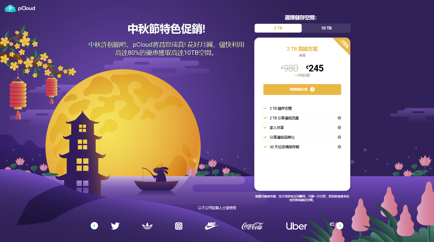 另外,最近pCloud为庆祝中秋节开工,特别推出中秋节促销活动,是包括所有的个人终身方案。