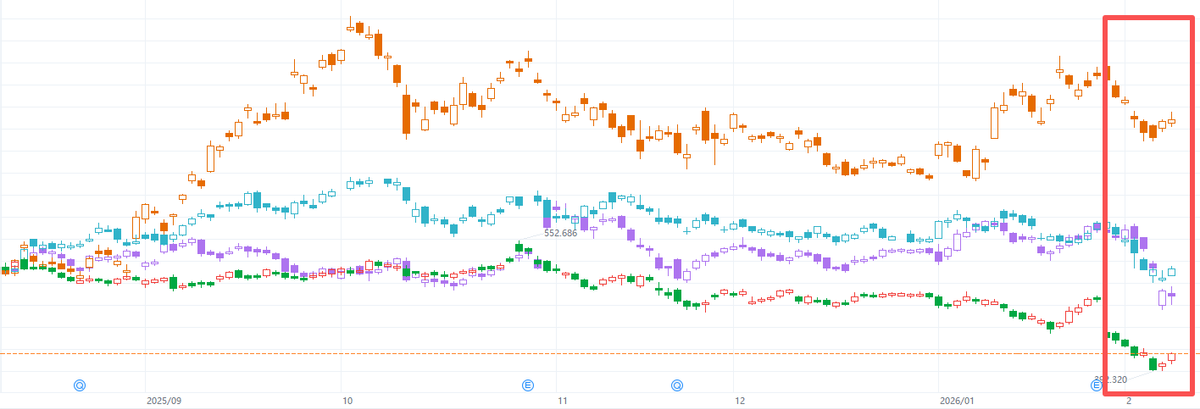 2月初,中美科技股的估值同步回调,但市场抛售的背后,实际上是两种性质完全不同的担忧。一个是对“有限支出”能否换来真实价值的怀疑,一个却是对“无尽支出”可能吞噬一切现金流的恐惧。