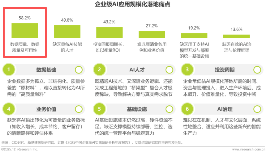 外卖是确定性的高频刚需,补贴能迅速验证留存与复购。相比之下,AI的“刚需”还极不清晰。面向企业端的大模型落地成功率依旧不高,艾瑞咨询的调查显示,超过一半企业级AI应用数据质量及可用性不足。而C端用户更是长期受互联网“免费+增值服务”模式影响,付费的认知和意愿较低。
