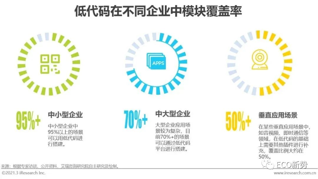 一是行业和场景覆盖面足够广。艾瑞咨询的《2021年中国低代码行业研究报告》(下文简称报告)显示,低代码平台目前覆盖了制造业、金融、医疗、房地产、零售、餐饮、航空等众多行业的不同应用场景。报告还指出,中小企业由于应用复杂度低、业务流程相对简单等原因,95%的应用场景均可用低代码来完成。