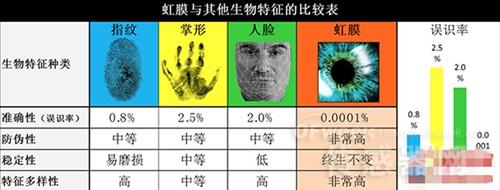 因为人眼的虹膜在出生 6 个月后即发育成熟,之后就会保持终生不变,更不会出现如指纹磨损、面容变化导致设备拒识本人的情况,而且眼球剥离人体后虹膜会随瞳孔放大而失去活性,很难被伪造。相较于指纹0.8%、人脸识别2%左右的误识率,虹膜识别误识率可低至百万分之一。下图是虹膜与市场现有其他生物特征的比较: