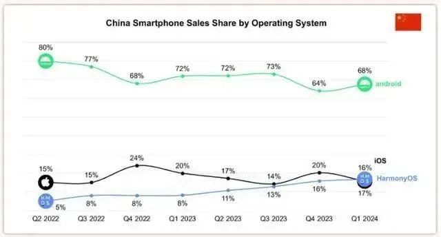 在操作系统上,华为鸿蒙今年上半年就已经超17%的市场份额,在国内超越了苹果的iOS的16%的市场份额;
