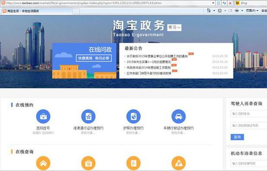 2015年3月,淘宝上线了”淘宝政务”服务(淘宝首页右上角网站导航-我帮你-网上办事-即可进入)。目前青岛政务已经入驻,成为淘宝网上首家”政务商店”。”互联网+政务”战略驱动政务创新,通过主流互联网入口优化办事前、中、后的用户体验,为市民提供更加便捷、安全的政务服务,让市民办事和淘宝购物一样方便;未来将根据移动端的特点来优化和定制政务服务的体验流程,将部分适合在移动互联网上开展的业务进行试点,让市民拿出手机即可找政府办事。截至2015年5月,汇集54个部门2400多项办事服务的网上便民服务大厅综合网办率已达53%。同时,老百姓可以通过在购买”政务商品”后作出”好评””差评”或”中评”来进一步促进督促政府完善提高服务能力,打造”服务型”政府。