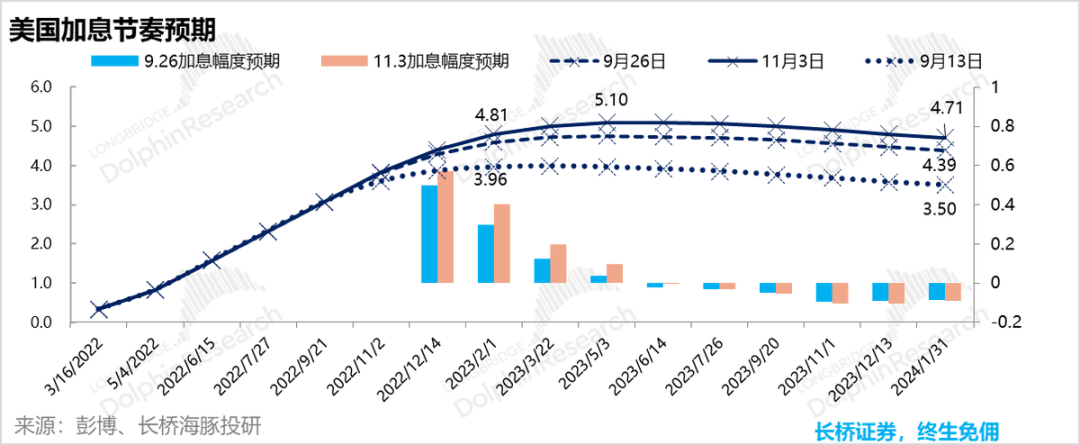 从海豚君11月3日在彭博上截取的市场对加息的预期基本对应接下里12月和1月的加息当中各加50个基点,跟上通胀率水准,然后进入慢加息或高位停滞,到2023年下半年开始有人预期会降息。