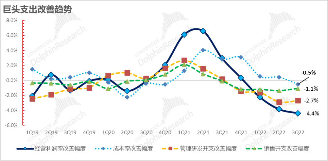 (3)人力成本压制:这波周期各大费用项中,最为刚性的是以人力投入为核心要素的研发投入成本。
