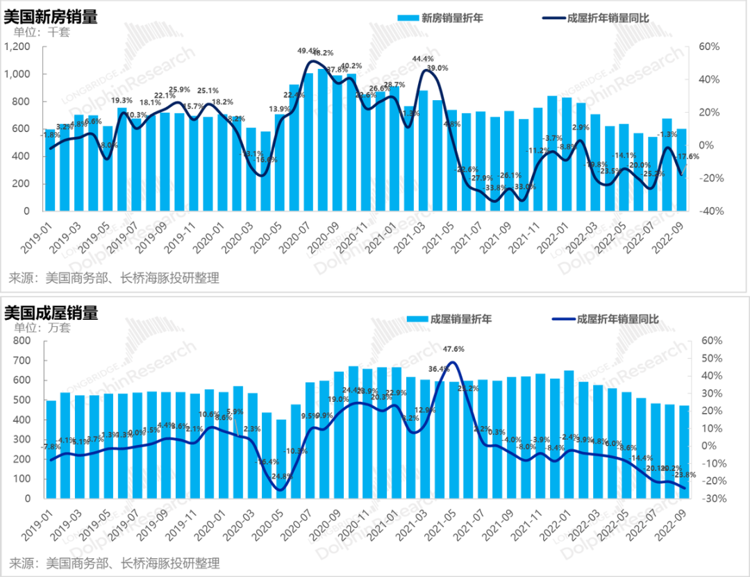 b). 房屋销量下泄:无论是成屋还是新房,进入9月之后下滑都非常明显,同比跌幅都在15-25%之间。
