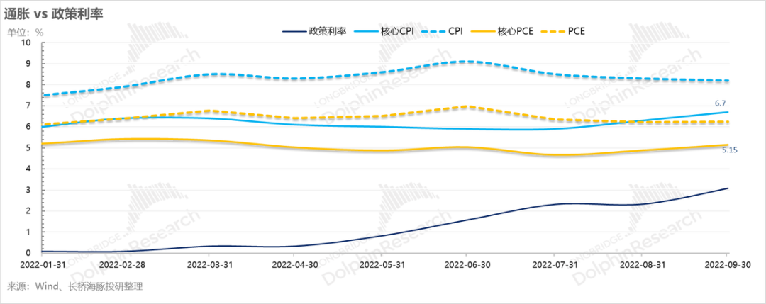 在观察几个核心指标:(1)9月核心CPI 6.7%,加息启动以来的九个月内波动在6%-6.7%之间;(2)9月核心PCE 5.15%,九个月波动在4.7-5.4%。尤其是9月单月,在加息大步快跑追赶通胀过程中,通胀环比同比似乎都在拉大。