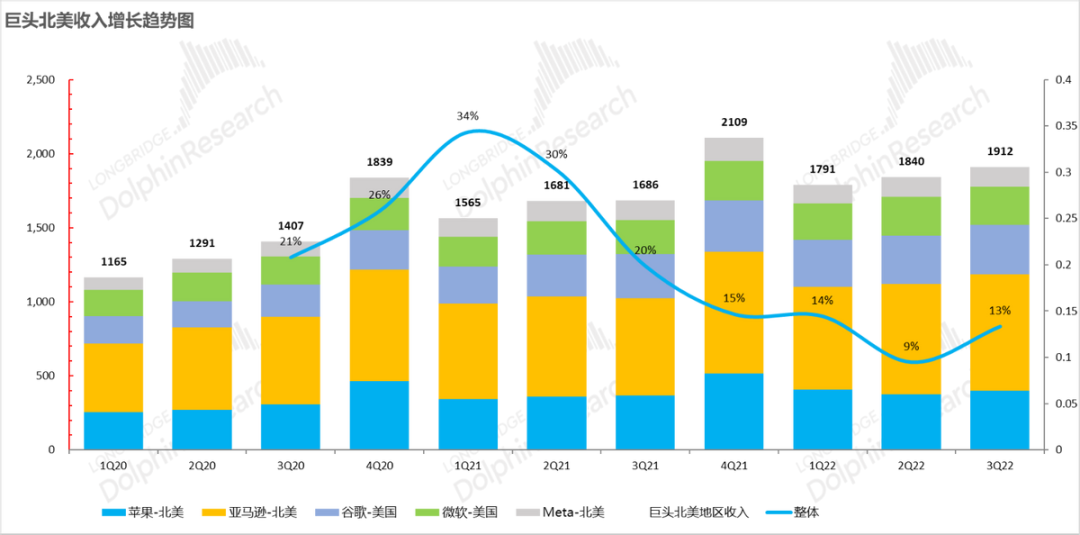 从互联网科技五巨头的整体收入增长来看,五巨头北美业务收入(用尽量精准意义上的美国地区收入,如无美国再用近似地区取代)三季度不仅没有降低,反而还在加速增长,没有巨头们指引得那么悲观。