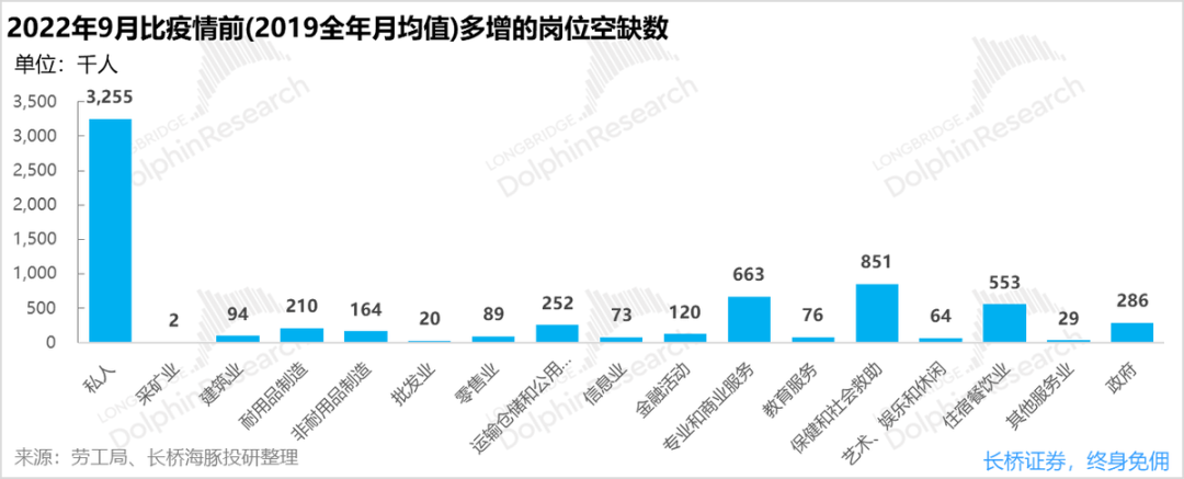 而结合这些行业目前仍待填补的岗位,可以看到核心的新增需求主要来自于医疗保健/社会救助、专业和商业服务,住宿餐饮更多是回补疫情中流失的就业人口,前面两项就占到了私人部门疫情后新增需求的50%。