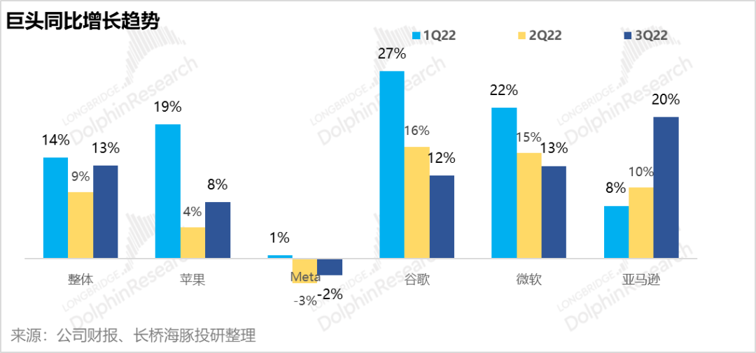 一个词来概括刚刚落下的美股三季度财报季的话,“巨头陨落”恐怕是最点题的描述。海豚君覆盖的巨头当中,苹果成为美股巨头中唯一还算坚挺的脊梁骨,微软、谷歌、亚马逊、Meta都已悉数卧倒。
