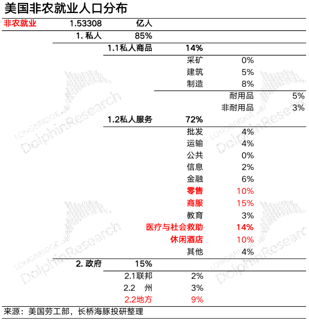 如果深究美国就业市场的供应矛盾,我们先来看当前美国非农就业的行业分布:从私人和政府两大部门来看,显然私人部门用人占比是大头,在85%,私人又分私人商品和私人服务,其中私人服务占大头,而私人服务当中,用人集中的四大行业主要是零售、专业和商业服务(类似地产经纪服务、会计审计、IT外包等等)、医疗和社会救助、以及休闲与酒店。