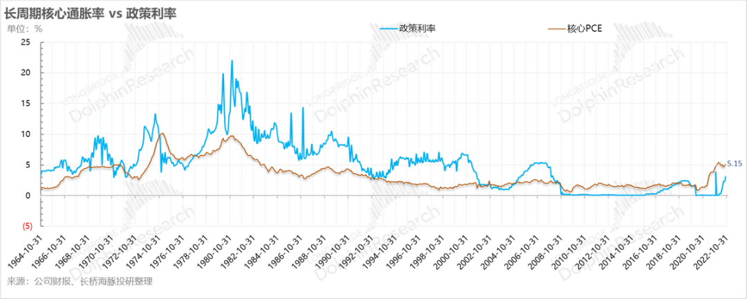 由于全球上一波通胀的历史太过久远,而从长周期从有限的历史信息来看,之前每一轮通胀周期当中,美联储加息之后政策利率的顶点都明确超过了当轮核心PCE通胀率的顶点。