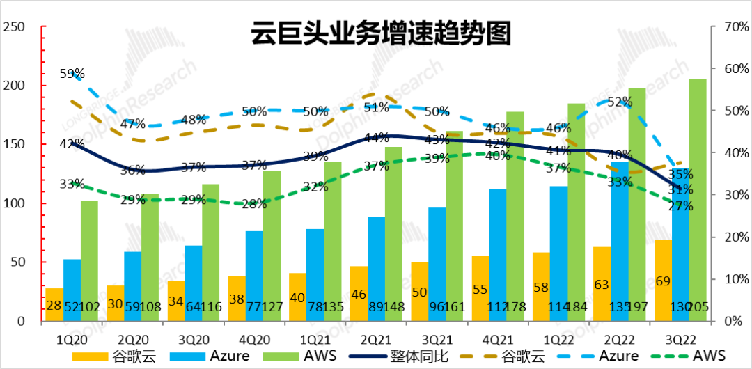 b.) to B 业务之公有云:云业务对应的是企业主对于IT支出的预算。可以看到,除了谷歌由于基数较低之外,三大公有云巨头的收入增长整体明显放缓,增速从三季度40%迅速拉低到31%。
