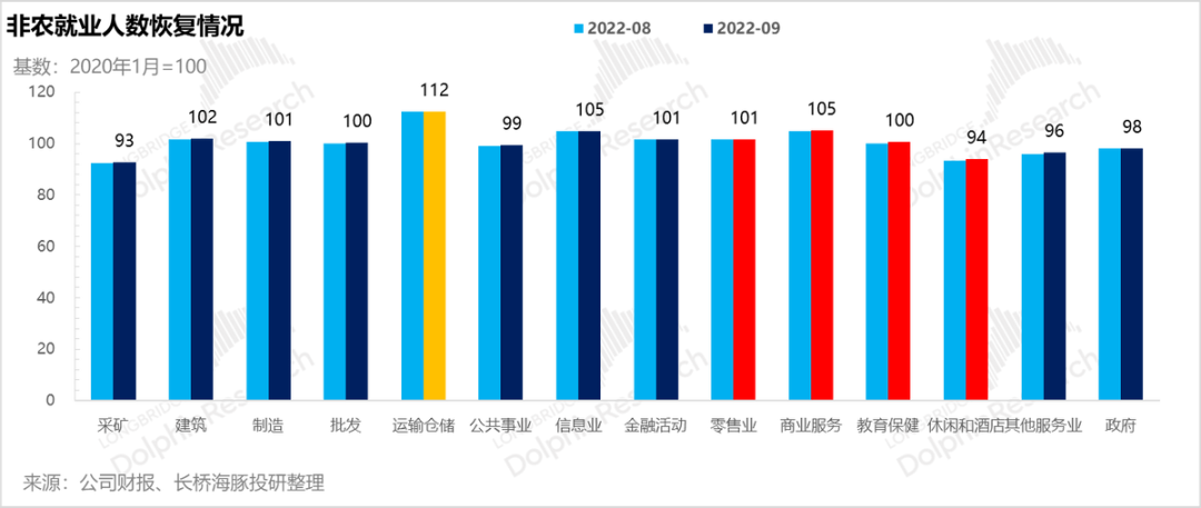 从这些行业就业人数相比疫情前的恢复程度来看,除了运输仓储就业人数远超疫情前(以2020年1月为基准)。前面海豚君说的四大人力密集型服务行业中,仅有休闲和酒店行业没有走到疫情前的水平。