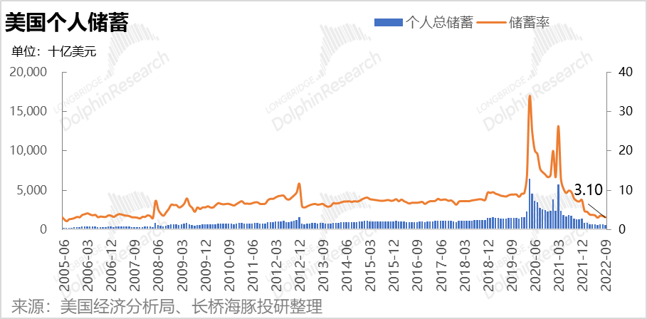 到9月可以看到,美国居民基本已经掏空了疫情时候的超额存款,储蓄率(储蓄/可支配收入)已经掉到了2007年之前才有的水准。