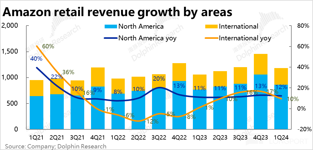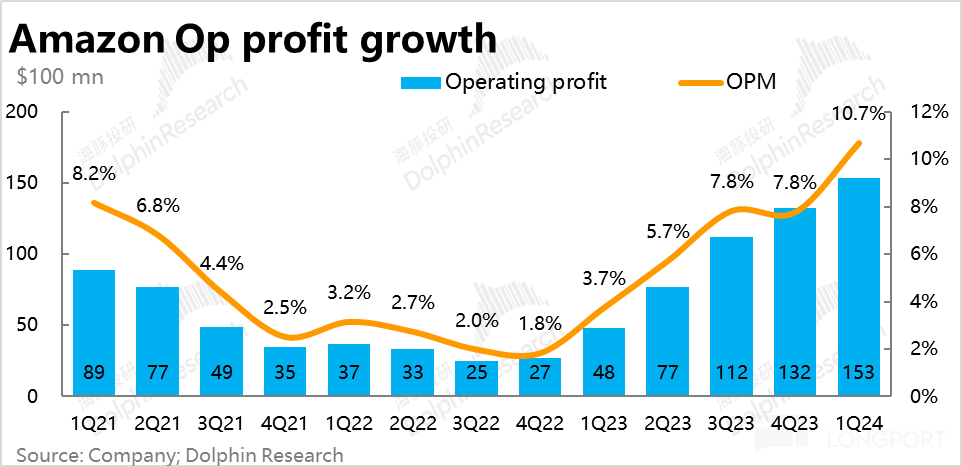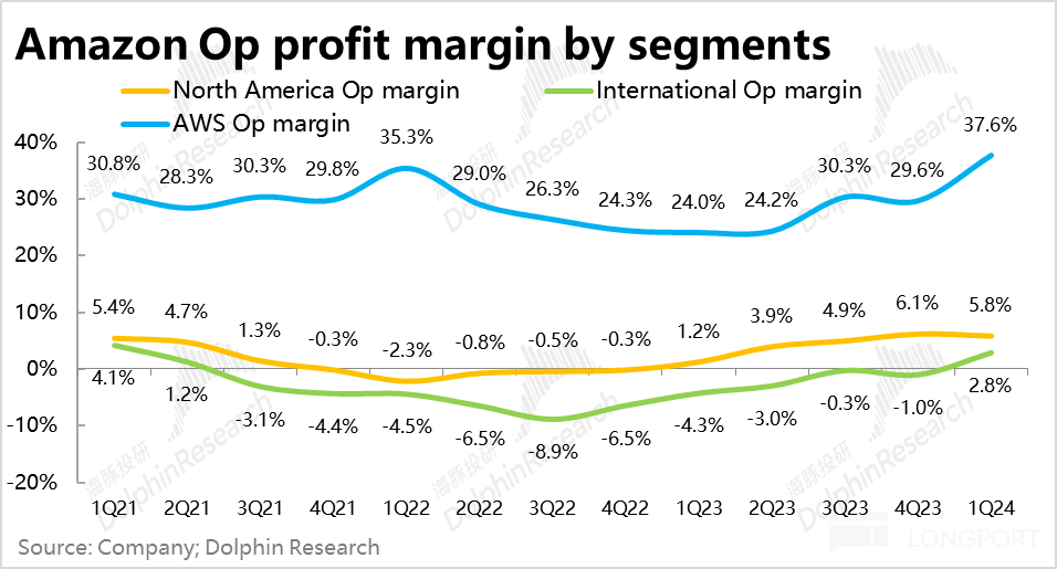 4. 北美零售高预期下惊喜不大,国际业务则超预期扭亏:本季北美零售板块的经营利润为49.8亿,虽利润率同比继续大幅提升4.6pct,也高于卖方预期,但相比海豚投研的预期是偏低的,我们认为相比买方预期大概率也并未明显领先。在当前估值和双位数北美零售业务利润率的愿景下,本季5.8%的利润率并不算很超预期。但国际零售板块本季直接扭亏为盈9亿经营利润,是AWS之外利润超预期的第二功臣。虽然海豚投研也预期今年国际业务能利润转正,但一季度就达2.8%的利润率,比我们的预期更强。
