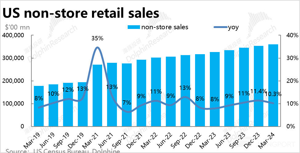 二、零售增长稳中略降,是稳健还是隐忧?零售板块的增长大体在预期之内,保持着稳健的增长。本季泛零售板块实现收入1183亿美元,同比增长11.6%,较上季度略有放缓2.4pct。