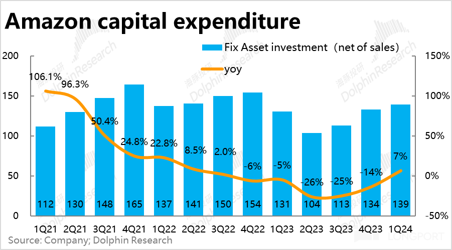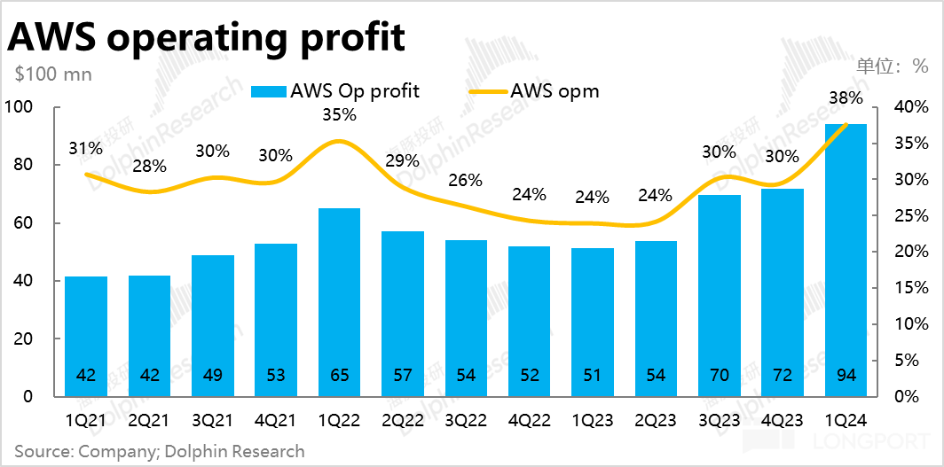 2. AWS收入利润全面强劲,本季最大亮点:本季度AWS收入250亿美元,同比增速拉升至17%。虽然业绩前市场已预期增速会拉升至15%左右,实际表现仍是更强。不过结合Azure和GCS同样超预期的表现,属于预期外,情理中。横向对比美国三大云服务商,本季GCS和AWS的增长加速幅度相比微软更快,增速的差距有所缩窄(亚马逊环比提速4pct,微软为0.8pct)。可以推见亚马逊和谷歌相比微软在AI功能/服务上的差距在被追赶、缩窄。利润角度AWS的表现更为惊人,实现经营利润94亿美元,远超预期的72亿。经营利润率从近30%大幅拉升至37.6%。但如此巨大的利润率拉升,似乎并不能完全由增长的复苏和AI功能的推广解释。上次如此巨大的单季利润率拉升(+5pct)还是在22年初折旧年限调整时,不能排除本季度也有会计调整的原因。