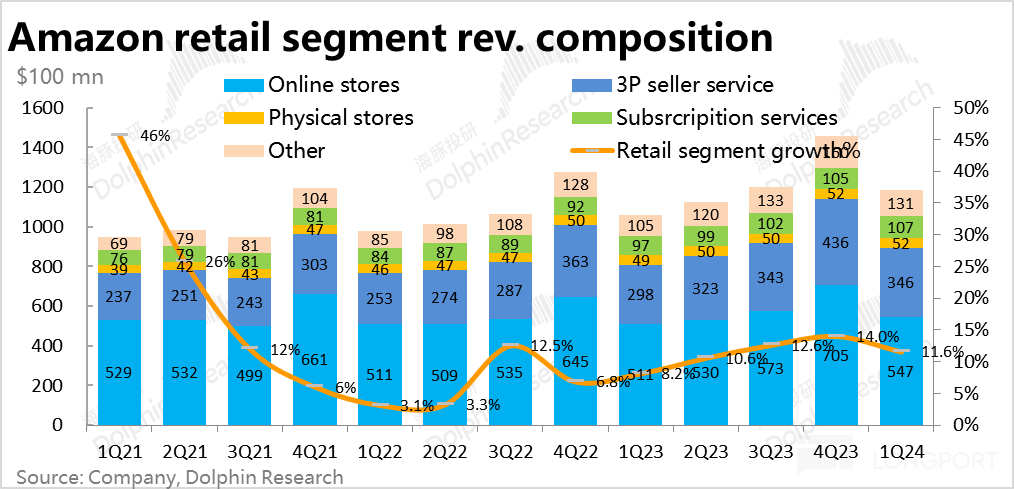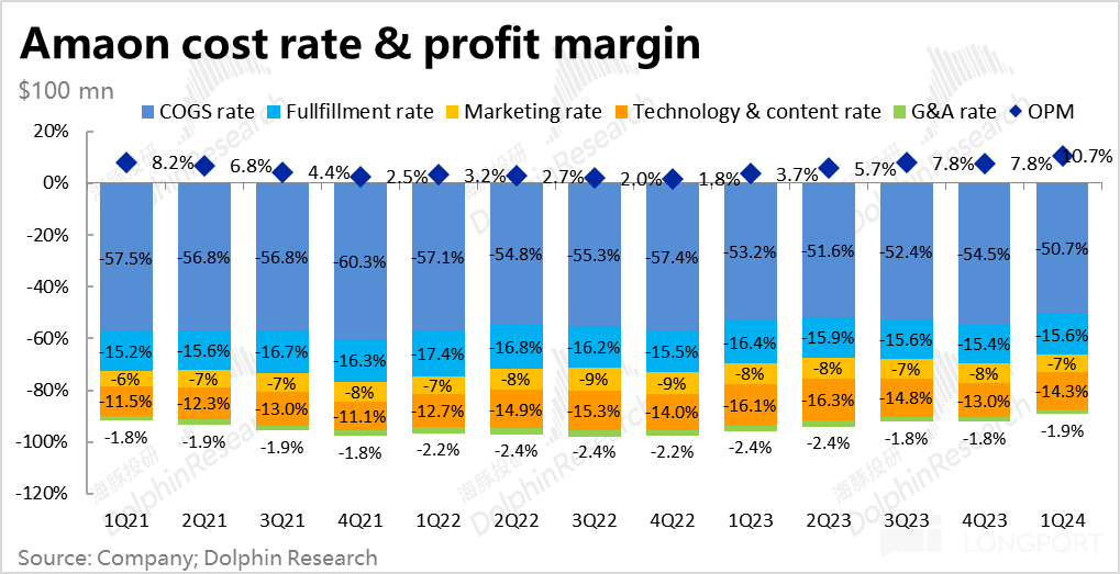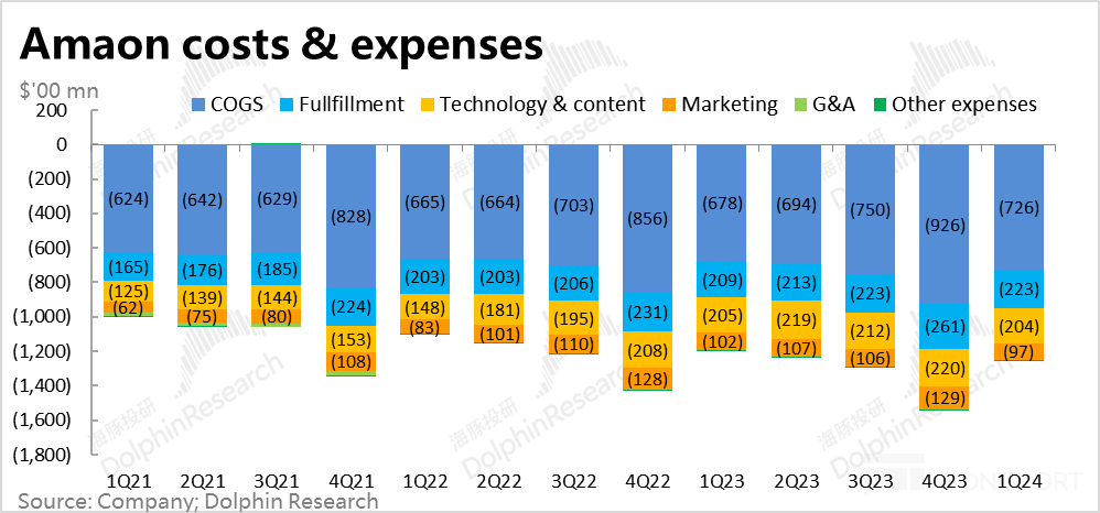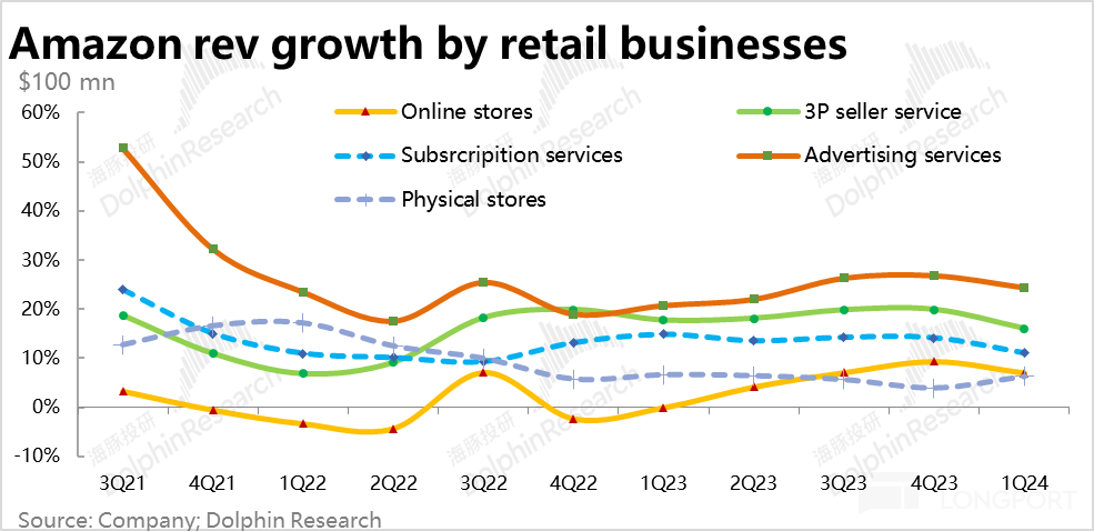 细分各业务板块来看,除了线下实体门店增速反而略微提速,其他各细分业务都是稳中略降的趋势。按增速排序,广告业务增长24.3%,在公司宣布了Prime Video上的广告业务后,卖方普遍对后续广告增长有不俗的预期。按改善幅度,营收贡献最大的线下零售的增速由3.9%改善到了6.3%,在经历的持续的增长下滑后,本次改善可能也归功于亚马逊配送时效性改善的利好。