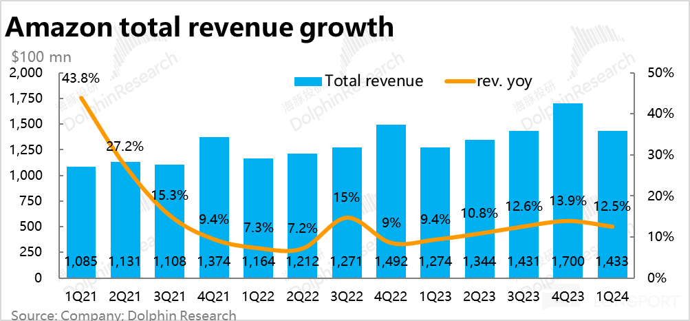 加总云业务和零售业务,亚马逊本季实现总营收约1433亿美元,同比增长11.9%,略高于市场预期的1426亿,主要归功于AWS比预期更强的增长。