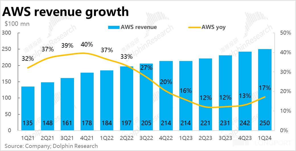一、AWS增速超预期回升,利润率暴涨,但不排除有会计因素本季度AWS收入250亿美元,同比增速拉升至17%。虽然业绩前市场也预期普遍增速会拉升至15%,实际增长仍是比预期更好些。结合先前微软和谷歌云业务同样超预期,亚马逊的表现也算情理之中。同样是归功于传统云业务支出的恢复,以及AI带来的增量需求。据公司披露,Anthropic的Claude 3模型和Meta的Llama 3模型,都已在AWS中全面推广,亚马逊自研的Titan模型(包括文字和图片处理功能)也已上线。
