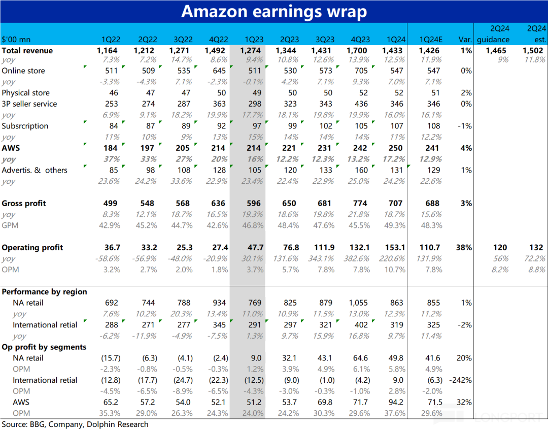 4月30日美股盘后,亚马逊公布了2024年第一季度财报,整体来看营收增长稳健,大体符合预期,亮点在云业务提速比预期更强(和同行一致);利润层面则又是一次幅度惊人的大超预期(+38%),同样主要归功于云业务,详细要点如下: