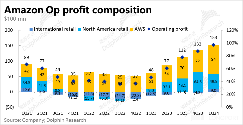 三、利润大超预期,AWS仍是最大功臣营收层面,亚马逊整体的表现可谓稳健。而利润层面则又是一次大超预期。具体来看,本季度公司整体实现经营利润153亿美元,远超卖方预期和111亿。据海外行,即便买方普遍预期更高在120~130亿 (海豚投研业绩前预期129亿),实际表现比买方预期还是更高。