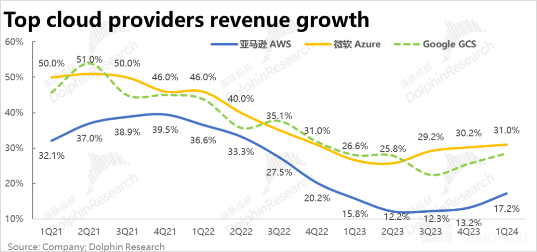 横向对比美国三大云服务商,可以看到本季GCS和AWS的增长加速幅度相比微软更快,增速的差距有所缩窄。海豚投研猜测,这个反转可能正是因为Google和Amazon也已逐步在自身云服务中跟进了AI模型,正快速追赶领跑的微软。
