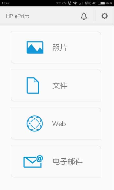惠普移动APP界面上,属于简洁小清新类型,在APP页面上的内容相对来讲较为简单,功能上,仅仅只能单打印界面,打印文档的类型来看,仅仅局限于图片,文件网页等。