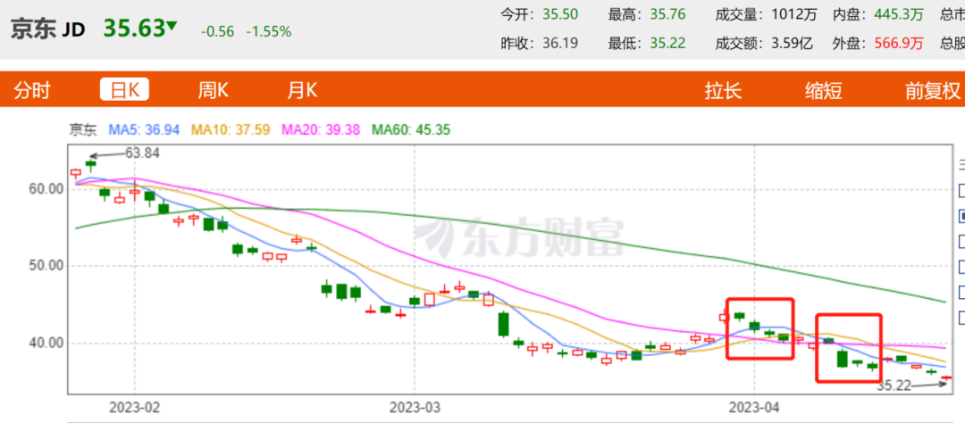 截至4月21日收盘,京东股价为35.63美元/股,跌幅1.55%,市值为560.8亿美元。距2021年2月26日的106.41美元/股,下跌了66.5%,市值蒸发了1114亿美元。即便是相比今年1月13日的64.79美元相比也下跌了45%。