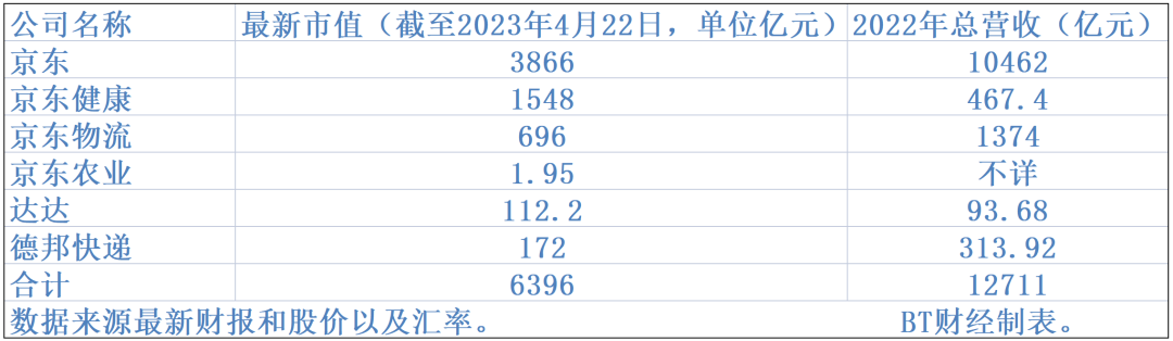 但目前京东的股价下跌严重,市值只有560.8亿美元(截止4月21日收盘),以最新汇率计算约合3866亿元,BT财经将京东系上市公司进行梳理如下。截至4月21日收盘,京东系上市公司总市值约为6396亿元,离万亿市值差了约3600亿元。总营收约12711亿元。