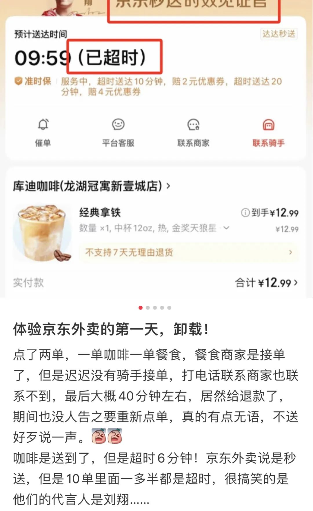 在小红书发出吐槽记录帖后,有同感的网友居然挺多。“试了一下京东外卖,现在饿着发呆打开小红书,怎么能那么慢?”“咖啡是送到了,但是超时6分钟!”