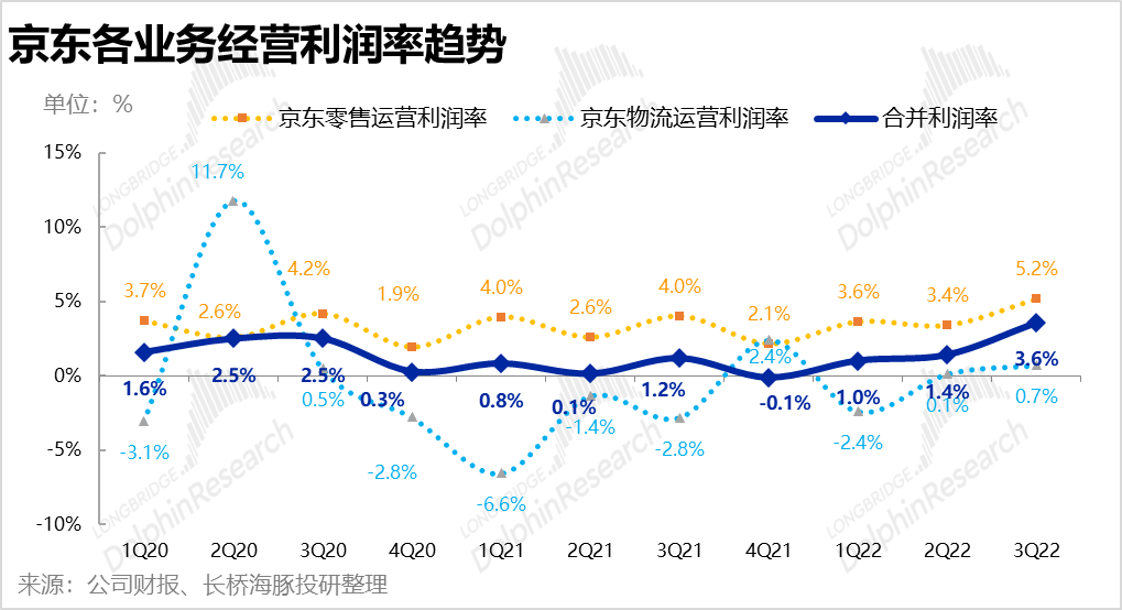 2. 最核心的京东商城板块,本季经营利润率也同比提升了1.2pct,明显高于公司指引的改善幅度。实现经营利润超过百亿达109亿元。而市场预期利润率的改善幅度仅0.4pct,与公司指引接近。