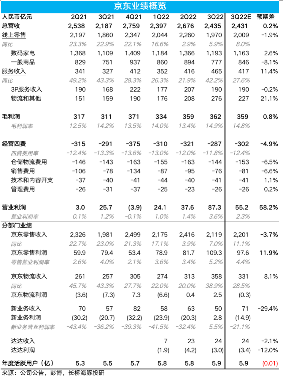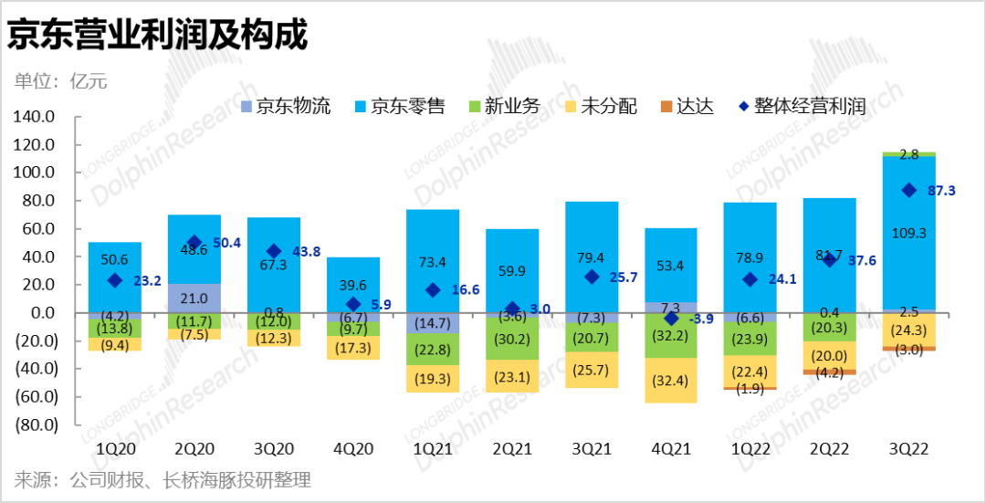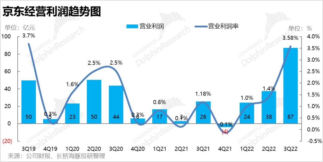 1.营收增长疲软,但利润着实惊人:整体业绩表现上,京东本季度实现营收2435亿元,同比增长11.4%,虽与公司指引和预期的2431亿基本一致。但市场预期应该是漏记了并表德邦物流会贡献的30亿左右收入。因此京东的营收增长实际是偏低的,并且细分板块的营收实际也不好看。但瑕不掩瑜之处是京东本季实现了87.3亿的“天量”经营利润,创史上最高,也大超了市场预期约60%。实际经营利润率高达3.6%,提升了约2.4pct,远好于公司指引约0.6pct的改善幅度。