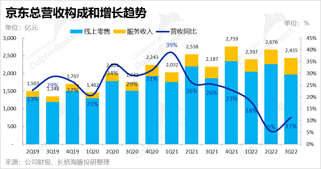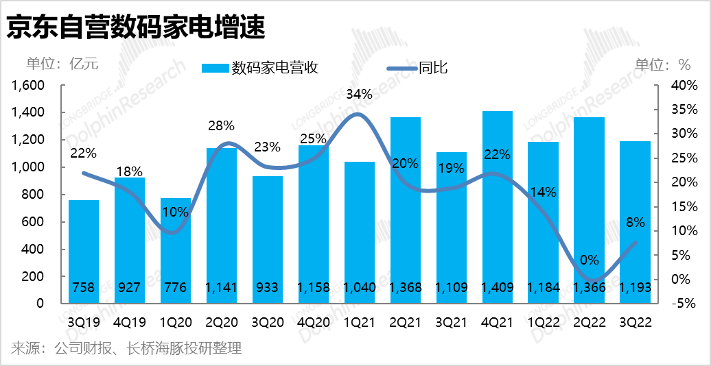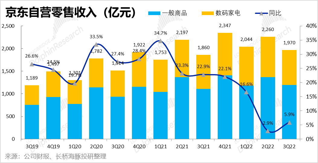 1.自营零售:首先从基石的自营零售来看,本季实现收入1970亿元,同比增速从上季度的3%反弹到约6%,但恢复力度实际不及市场预期的2009亿元。相比之下国家统计局公布的线上实物零售大盘增速在7%,京东自营零售增速罕见的低于行业大盘着实观感不好,也再度验证了市场担忧京东营收增长放缓并不只是疫情影响,而是趋势性的。