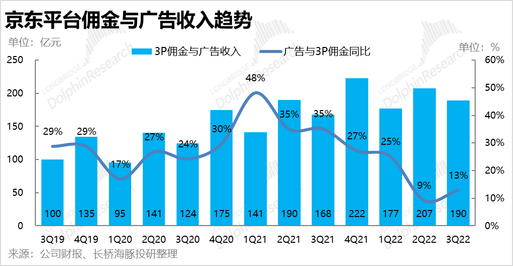2.平台服务:主要反映京东主站和京东到家佣金和广告的平台服务本季收入190亿元,与预期完全一致,同比增长13%,增速有所反弹。在自营表现不佳,且卖货也履约不畅的情况下,3P业务也难有领先的表现。不过剔除并表达达后贡献的约10亿平台收入,可比增速便仅有7%了,仅仅略高于自营收入增长。