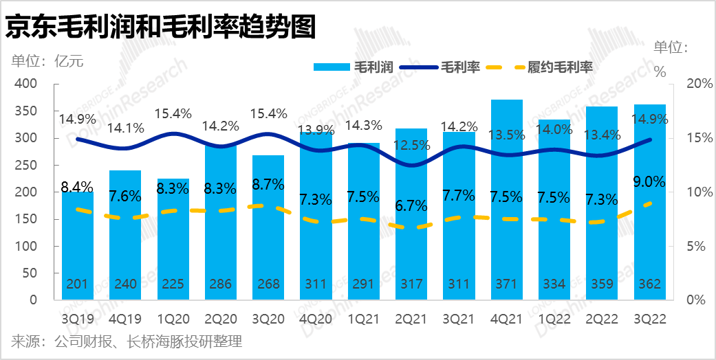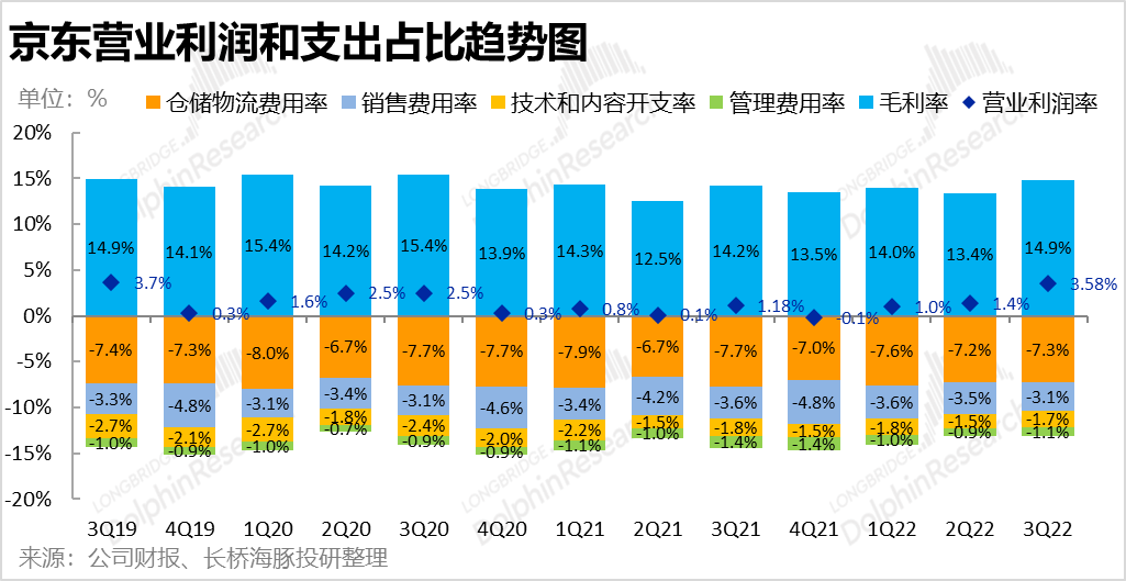 1.毛利润改善符合预期:本季京东实现毛利润362亿元,符合市场预期的359亿。毛利率也同比由14.2%提升到14.9%,增加70个基点与上季度同比改善90个基点的程度接近。根据公司二季度的电话会,毛利率提升的原因主要是公司发现在减少了对用户的补贴后,用户依旧留存,使用心智已经养成,因此毛利改善的趋势在今年全年都能持续,本季度也应验了公司的指引。