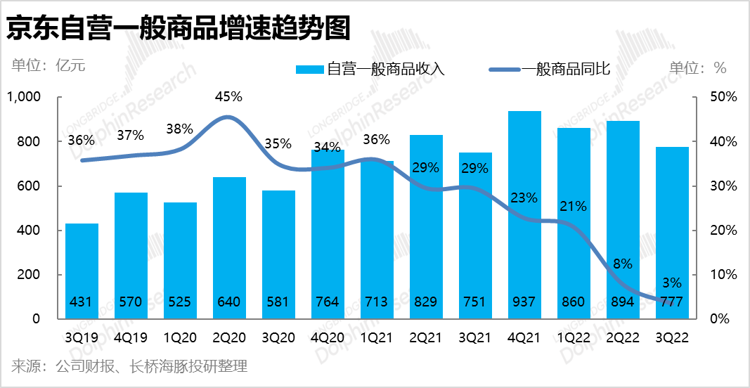 与通电类产品表现完全相反,京东自营一般商品是预期高但实际表现差,本季度收入777亿元,远远低于预期的846亿,同比增速也继续下降到3%,甚至比疫情间还低。然而从大盘表现来看,食品粮油和日用品近几个月一直是增长最为坚挺的品类,这也是市场预期较高的原因,但京东的变现却反而更差。原先食品、日用品等有线上渗透率提升的逻辑,是京东继续增长的主动力之一。而如此表现势必让市场相当担忧。