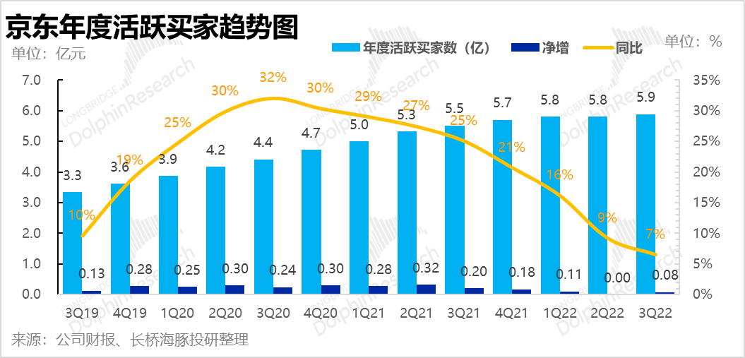 5.用户量:另外,作为国内三大电商平台中唯一还披露用户数据(同时也可能是唯一还有增长空间的),到三季度,京东的年活跃用户数为58,830万人,继二季度难看的基本无增长后,本季度年活用户总算重新环比增长了约800万人。虽然增量放缓,但对用户数量本就最少的京东,若用户停止增长就真是“不可承受之重了”。