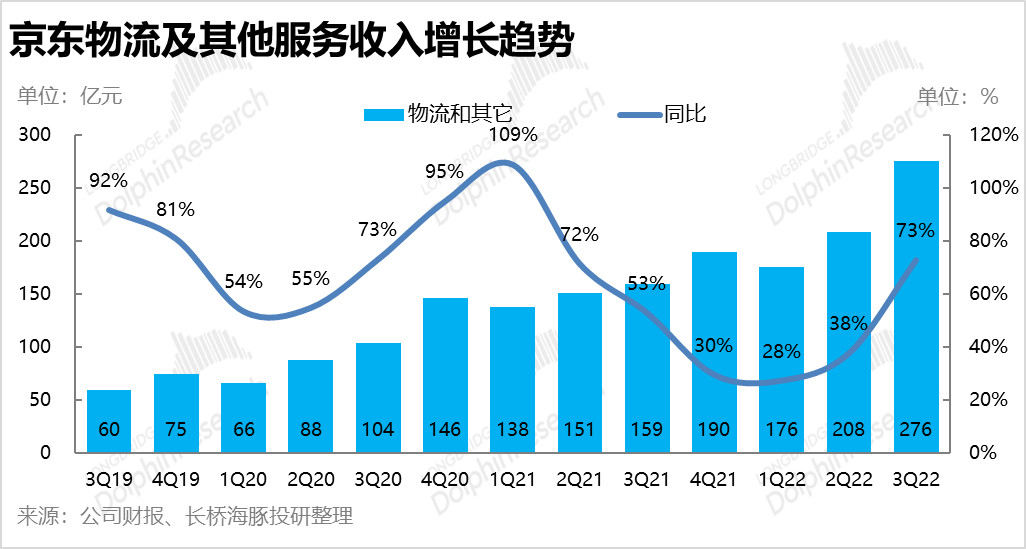 3.物流与其他服务:包括京东物流、达达快送、和7月并表的德邦物流的物流板块本季度收入276亿元,同比增速高达73%,远超出市场预期的227亿。但海豚君认为市场预期可能并未体现并表德邦的贡献。不过,即便剔除并表达达贡献的约13亿收入和并表德邦贡献的收入(具体规模未知但应当不到40亿),物流板块的可比营收增速还是相当可观的,反而成为公司营收增长的主要贡献。