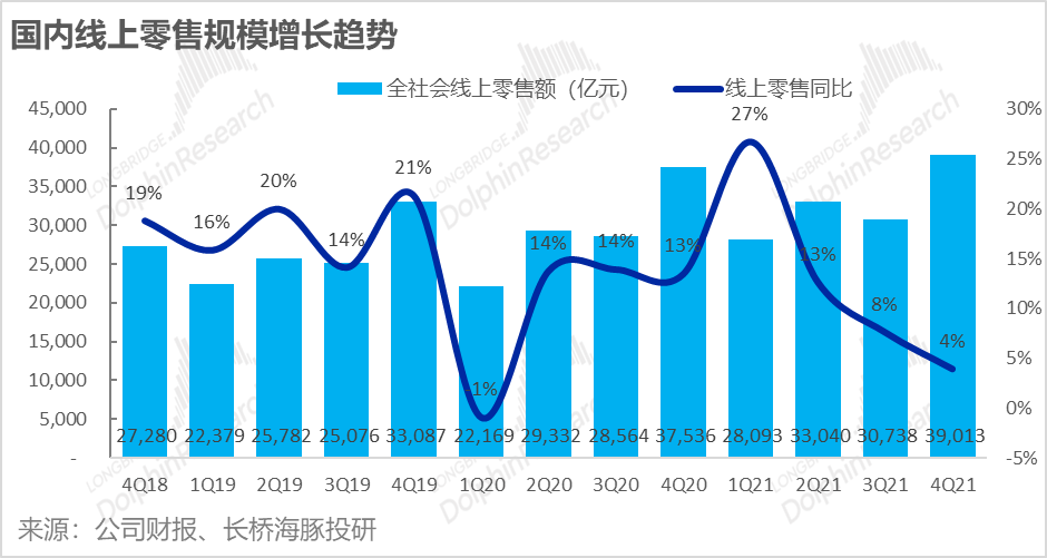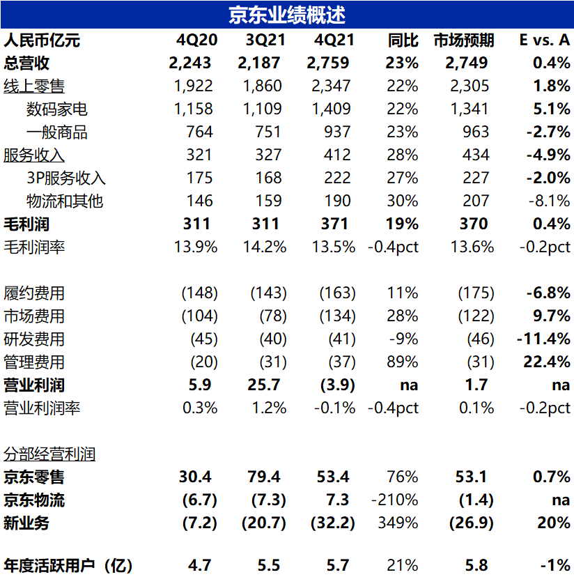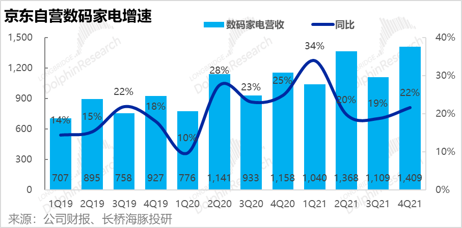 1.首先京东的基石业务--1P自营零售本季度收入2,347亿元,同比增长22%,略微高于市场预期的2305亿元。本季增速与上季度的22.9%基本一致,而全社会线上零售大盘4季度同比增速则从3Q的8%,显著下降到4%。因此京东在行业逆风中,仍在顽强前行,市占率提升。