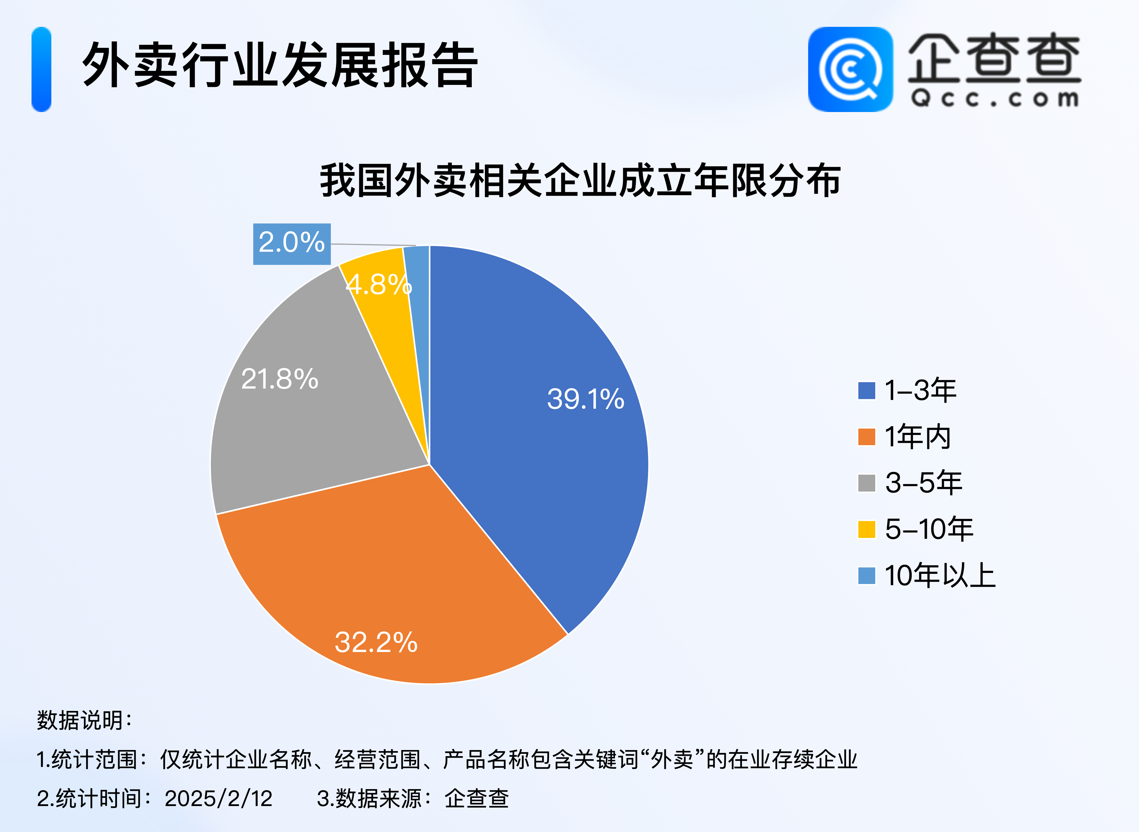 企查查数据显示,我国现存310万家外卖相关企业。成立年限上,我国超七成外卖相关企业在3年内成立,其中成立年限在1-3年之间的企业最多,占比39.1%,成立1年内的企业占比32.2%。