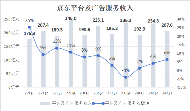 内容生态这一仗的输赢直接关系到开放生态的成败,对于财报的影响不止是日用百货收入,由于缺乏经营场,POP商家也无法完全放开手脚。这一点,从第三季度平台及广告情况便能窥知一二。截至9月30日,京东平台及广告收入207.6亿元,同比增长6.3%,有回暖,但难言满意。