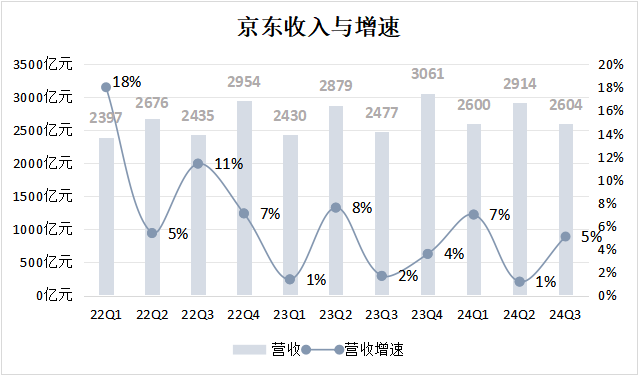 11月14日,京东发布2024年第三季度财报,数据显示单季度实现收入2604亿元,同比增长5.1%。其中京东零售收入2250亿元,同比增长6.1%。