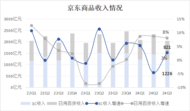 3C是京东的基石,也是京东自营体系最容易发挥优势的赛道。第三季度,京东3C收入1226亿元,同比增长2.7%,止跌企稳。