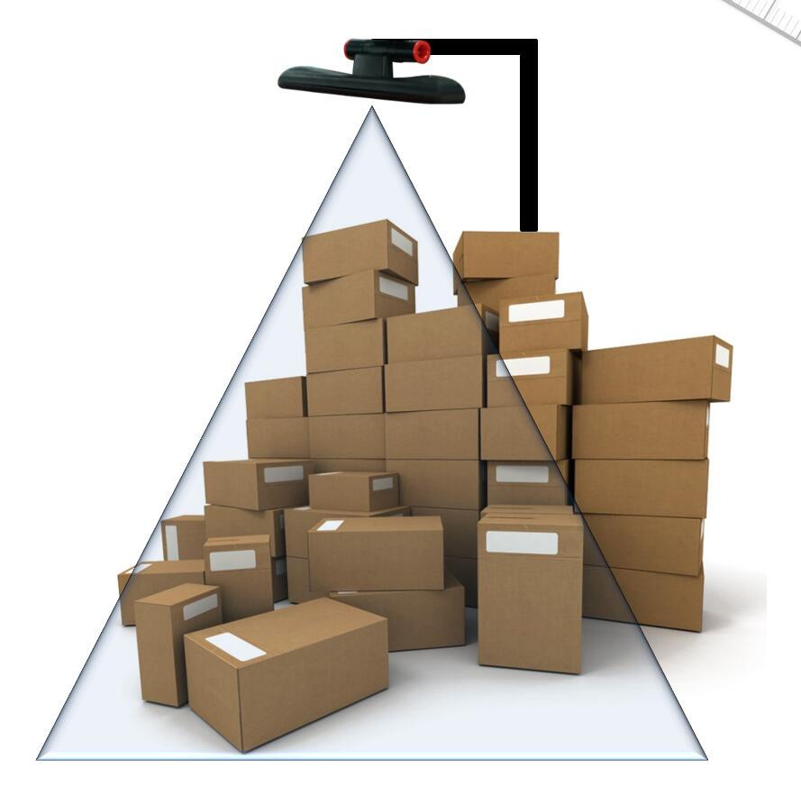 京东研发人员将RealSense摄像头悬挂在约两米高的悬挂架上,之后将需要测量的大批量物品堆放在摄像头正下方,再之后只需要2秒钟左右的时间,就可以将这些商品的组合体积测量出来,这比单纯利用人力拿着皮尺去测量的效率要明显提升很多。