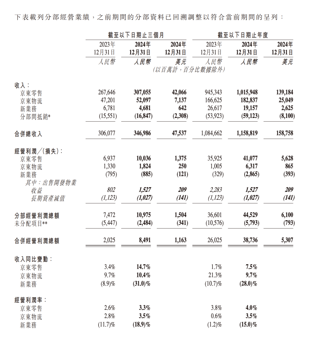 京东 2024 年第四季度财报为营收增长贡献最多的是京东的主营业务京东零售。当季京东零售收入 3070.55 亿元,同比增速达 14.7%,是京东包括物流、新业务等在内的分部收入中增速最高的。今年前三季度,京东物流的收入增速都要高于零售板块。